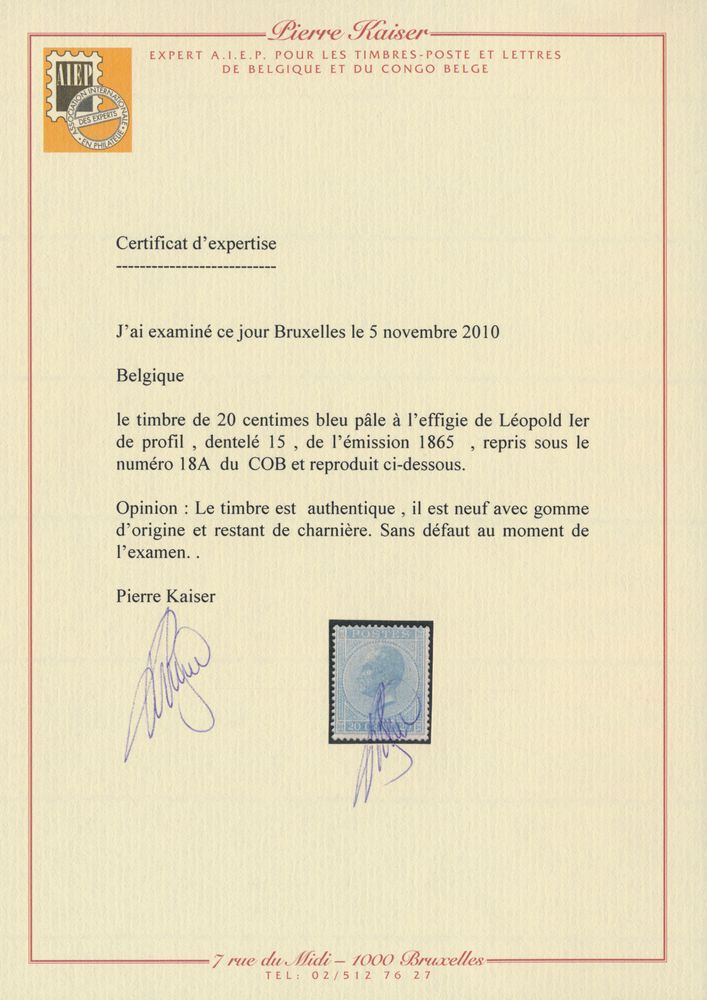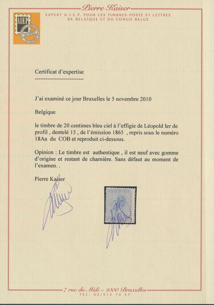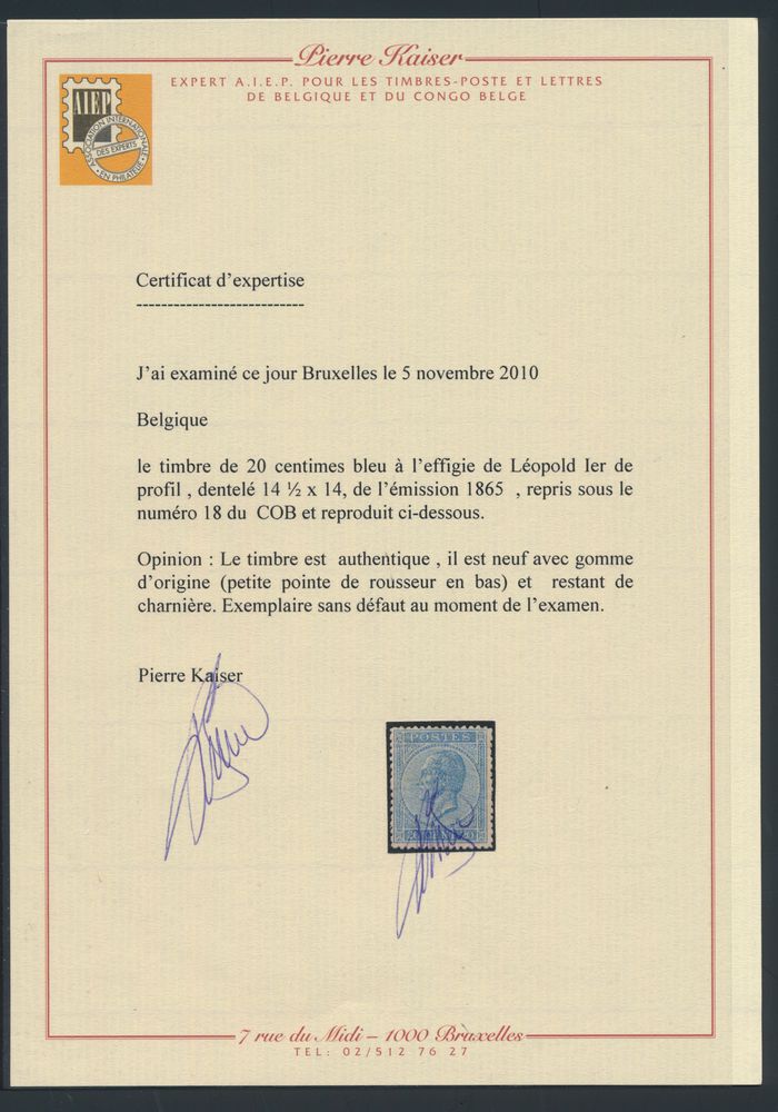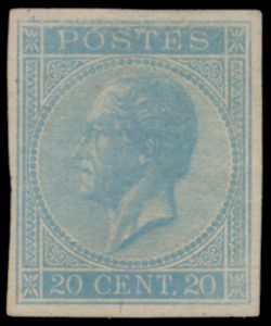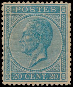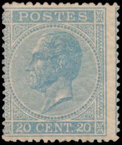 1483 og imageN° 18 '20 cents. blue, perf 14 1/2x14' very fresh stamp despite tiny brown dot, with photo certificate, vf/f (OBP €1,270)(Image 1) (Image 2)