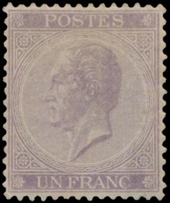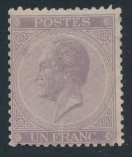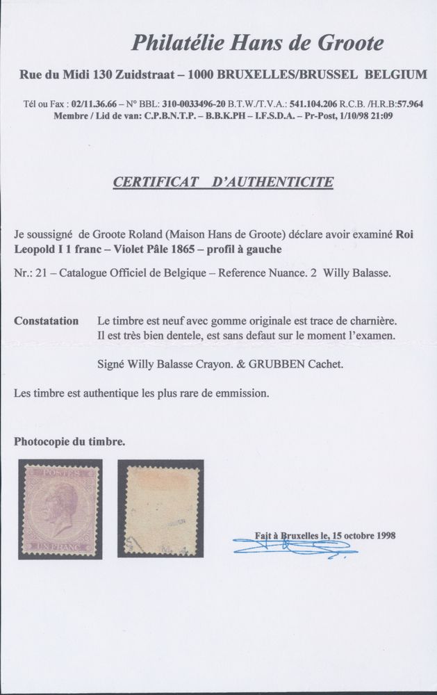 1498 og imageN° 21B "1fr. lilac" in perfs 15, for this issue very nice centring, perfs and gum restored, photo certificate De Groote dd. 15/10/1998, various expert marks, f/to be checked (OBP €4,100)(Image 1) (Image 2)