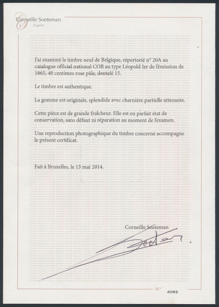 1497 og imageN° 20A "40c. pale pink" in perfs 15, nice centring, but small gum repair in centre of stamp, photo certificate Soeteman dated 13/05/2014, fresh stamp, vf/f (OBP €2,050)(Image 1) (Image 2)