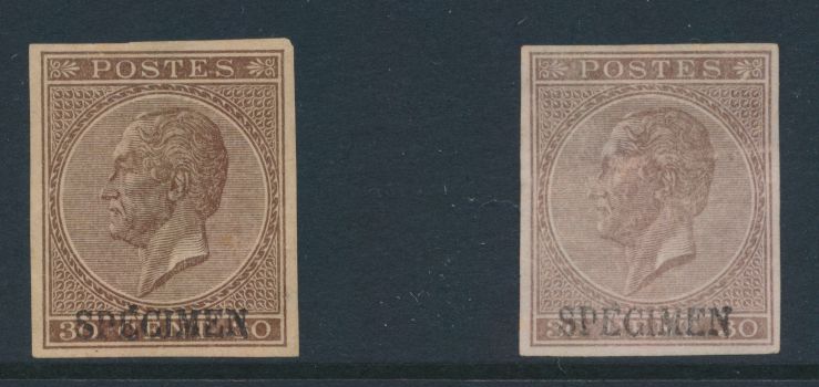 1491 ng imageN° 19 and 19a "30c. dark brown and bister brown", both stamps restored, with overprint "SPECIMEN", f/to be checked (OBP €420)(Image 1) (All Images)
