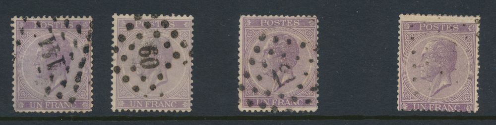 N° 21 "1fr. violet" (4x) with different perfs, 4 different