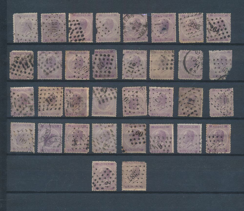 N° 21 "1fr. violet" (34x) Many different colour shades, mixed