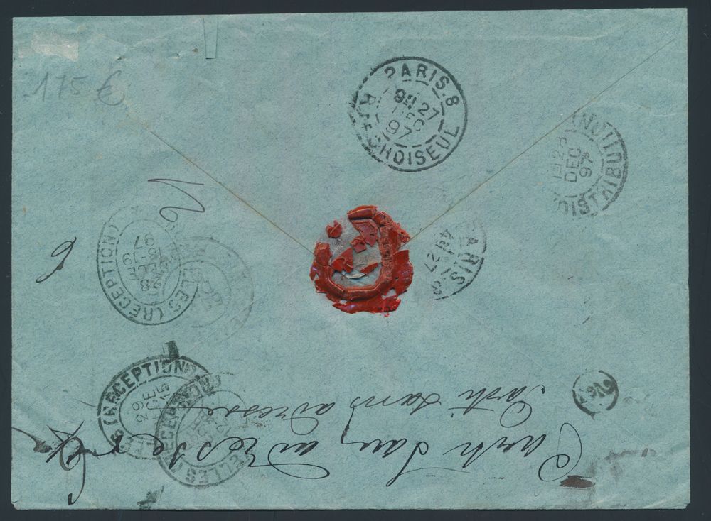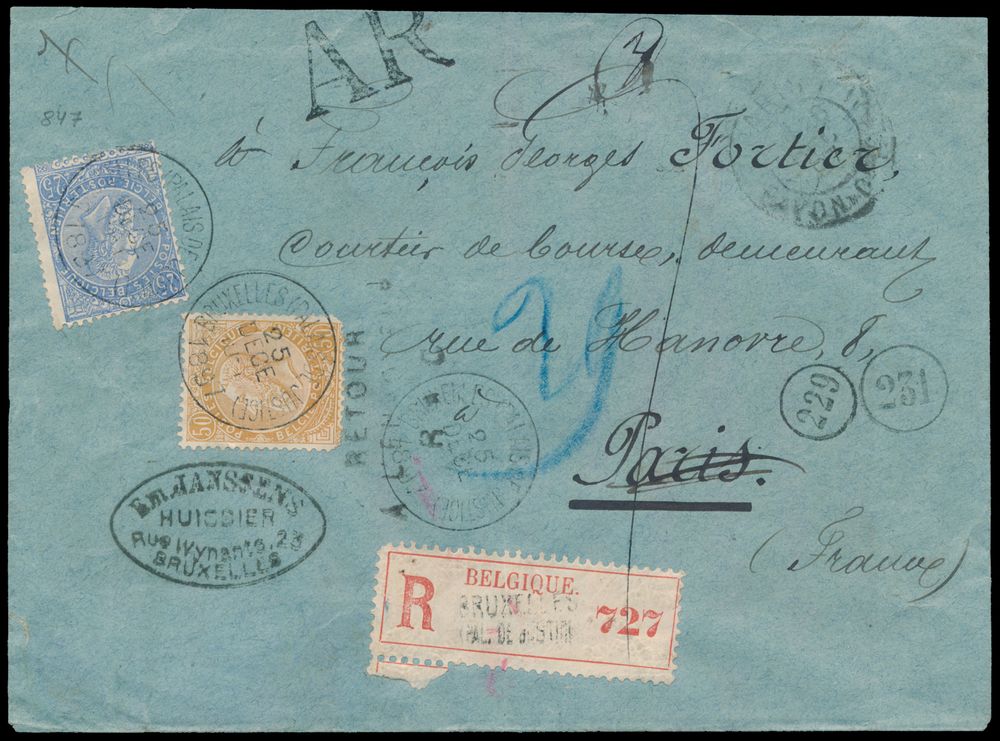 1786 image1897 N° 60 and N° 62, on registered envelope, cancelled "Bruxelles (Palais de Justice)", dated 25 December 1897 to Paris (France), manuscript "Parti sans adresse" and with "AR" stamp, vf(Image 1) (Image 2)