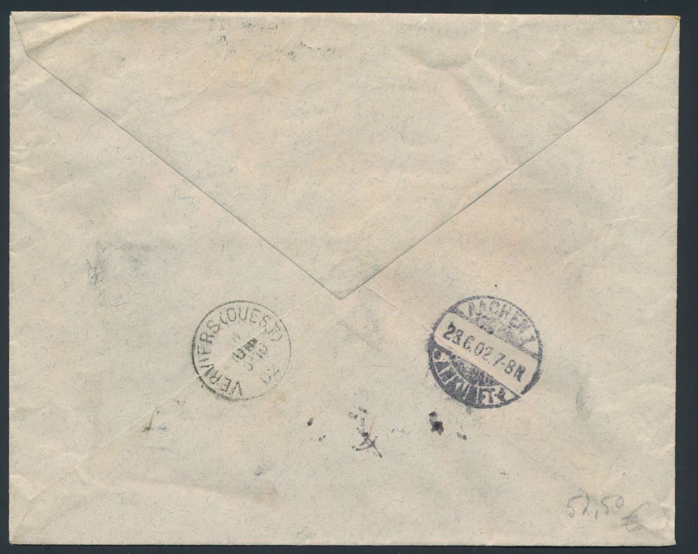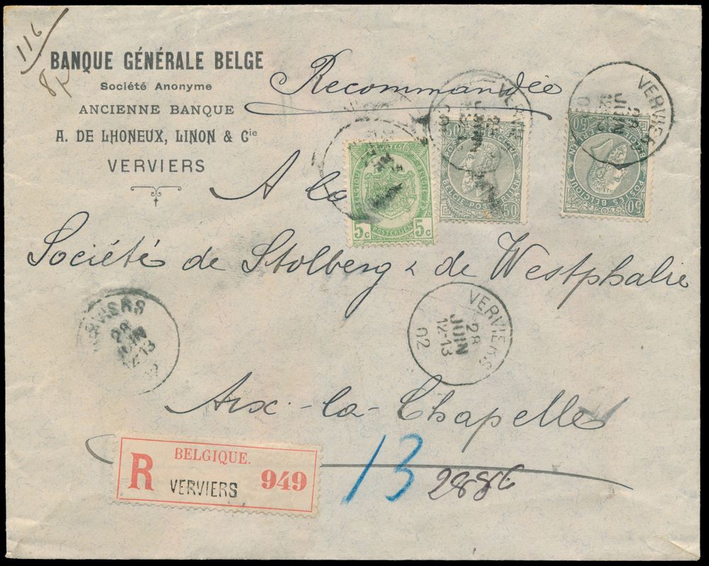 1796 image1902 N° 56 and 63 (2x) on registered envelope, from Verviers, dd. 28 June 02, to Aix-La-Chapelle (Germany), manuscript "116/8p", eightfold charge, postage is "80c. (8 times "10c.") and registration fee is "25c.", together "1.05fr.", vf.(Image 1) (Image 2)