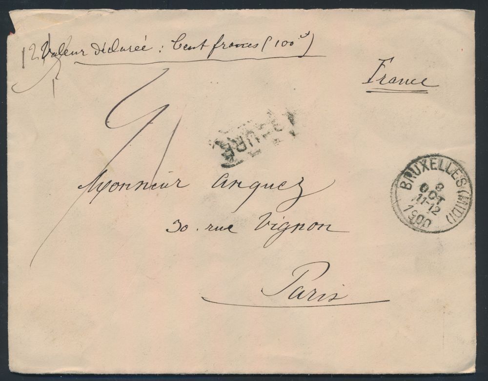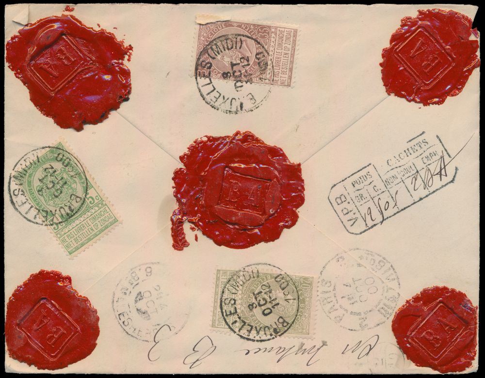 1792 image1900 N° 56, 59 and 61 on insured letter for "hundred francs", from Bruxelles (Midi) to Paris (France), dated 8 October 1900 with red wax seals (5 items), total franking is "60 centimes", vf(Image 1) (Image 2)