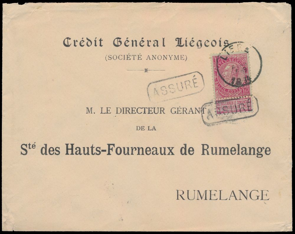 1782 image1894 (+/-) N° 58 "10c. pink", on voucher (without denomination), "Assuré" in box (2x), from Liège (probably 1894) to Rumelange (Luxembourg), letter head of "Crédit Général Liégeois", vf(Image 1) (Image 2)