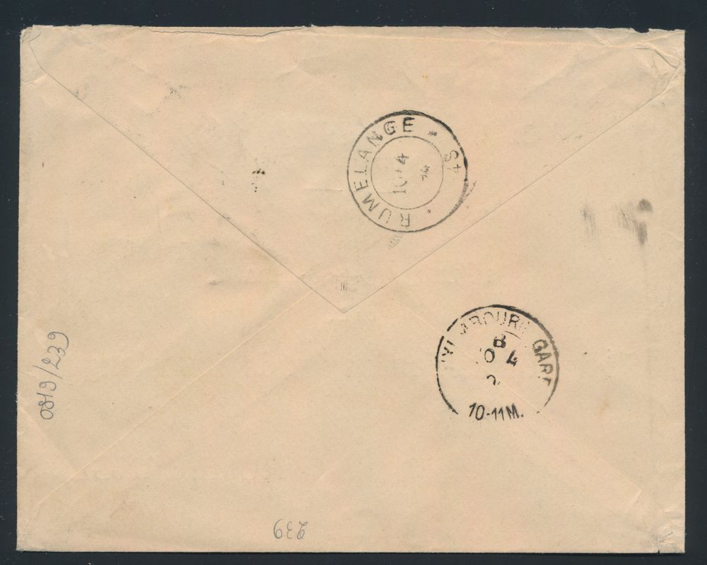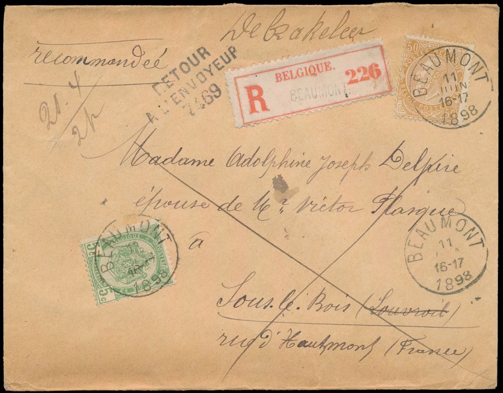 1788 image1898 N° 56 and 62, on registered letter, manuscript "21.4/2" second weight class, from Beaumont, dated 11 June 1898, to Sous le Bois (France), letter could not be delivered, therefore cancelled in three lines "Retour à l'envoyeur 7469", nice manuscript of the postman on the reverse, as well as several postmarks, vf(Image 1) (Image 2)