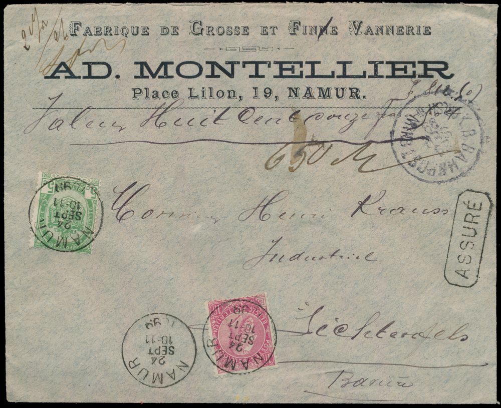 1789 image1899 N° 56 and 64, insured letter of "812fr.", weight 21 grams, sent from Namur, dated 24/09/99, to Lichtenfels (Germany), back 6 wax seals, franking "105c.", vf(Image 1) (Image 2)