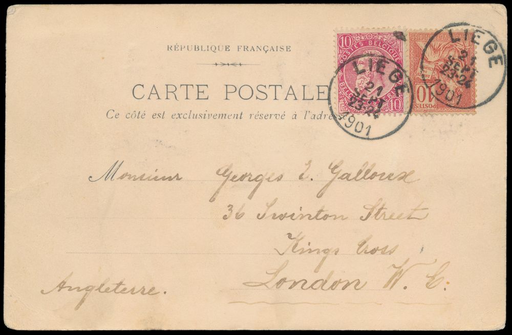 1795 ZK image1901 N° 58 "10c. carmine", together with French stamp Yv. n° 116, on picture postcard, from Liège, dated 21 September 1901, to London (England), mixed postage, vf(Image 1) (Image 2)