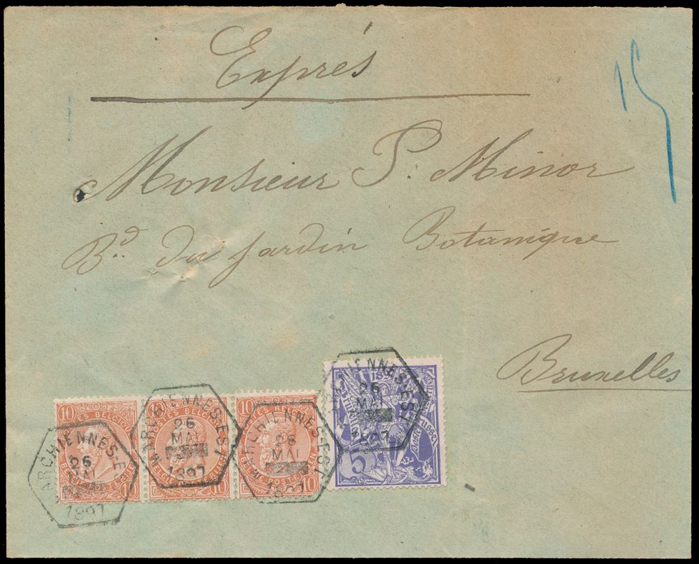 1785 image1897 N° 57 (3x) and 71, express cover, from Marchiennes-Est, dated 26 May 1897, to Bruxelles, vf.(Image 1) (Image 2)