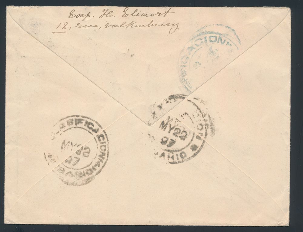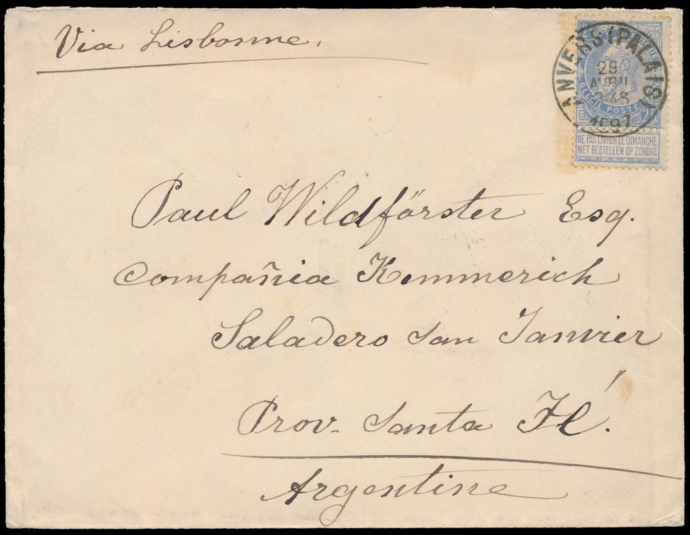 1787 image1897 N° 60 "25c. blue", on letter without content, from Antwerp (Anvers "Palais"), dated 29 April 1897, to San Janvier (Argentina), manuscript "Via Lisbonne", vf.(Image 1) (Image 2)