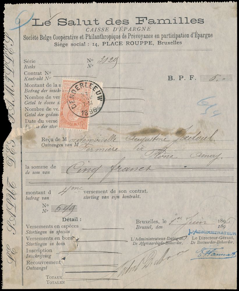 1784 image1896 N° 57 "10c. orange red", on receipt of "5 francs - Le Salut des Familles - Caisse D'Épargne" cancelled Denderleeuw, dated 31 May 1896, to Amay, vf/f(Image 1) (All Images)