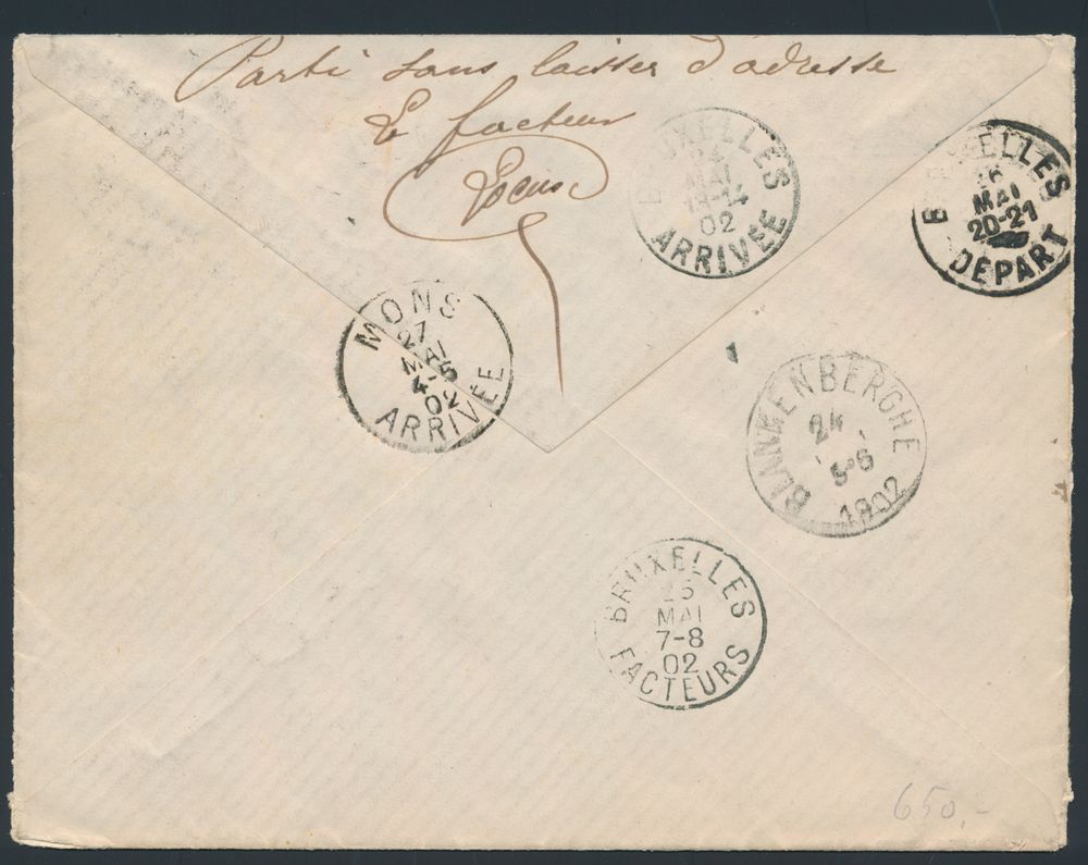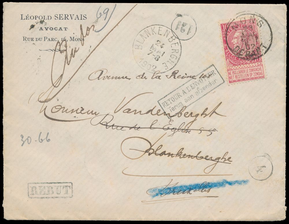 1797 image1902 N° 58 "10c. carmine" on cover, from Mons with cancellation "Mons Depart", dated 23 May 1902, to Blankenberghe, letter could not be delivered, beautiful black stamp "REBUT" in frame and "Retour à L'envoyeur" (Return to sender), manuscript on reverse "Parti sans laisser d'adresse - le facteur - signature", multiple postmark on reverse, vf(Image 1) (Image 2)