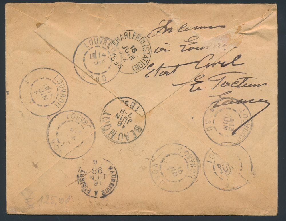 1781 image1894 N° 56 (3x) and 57 on cover with contents, from Bruxelles, dd. 17 March 1894, to Monte Carlo (Hôtel de Louvre, arrival postmark 19 March 1894), manuscript on back (difficult to read - forwarded to Hôtel Louvre Paris - Manuscript", "Par l'hôtel du Louvre le 3 Juin"), nice hotel cancellation cancelled on 1 July 1894, letter is forwarded to La Bourboule (Puy de Dome), arrival 8 June 94, vf/f(Image 1) (Image 2)