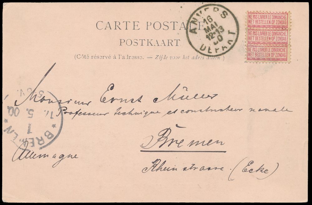 1794 ZK image1900 N° 58 "10c. pink", franked with the vignette three times on picture postcard, not cancelled and with departure stamp Anvers Depart, dated 16 May 1900 to Bremen (Germany), vf(Image 1) (Image 2)