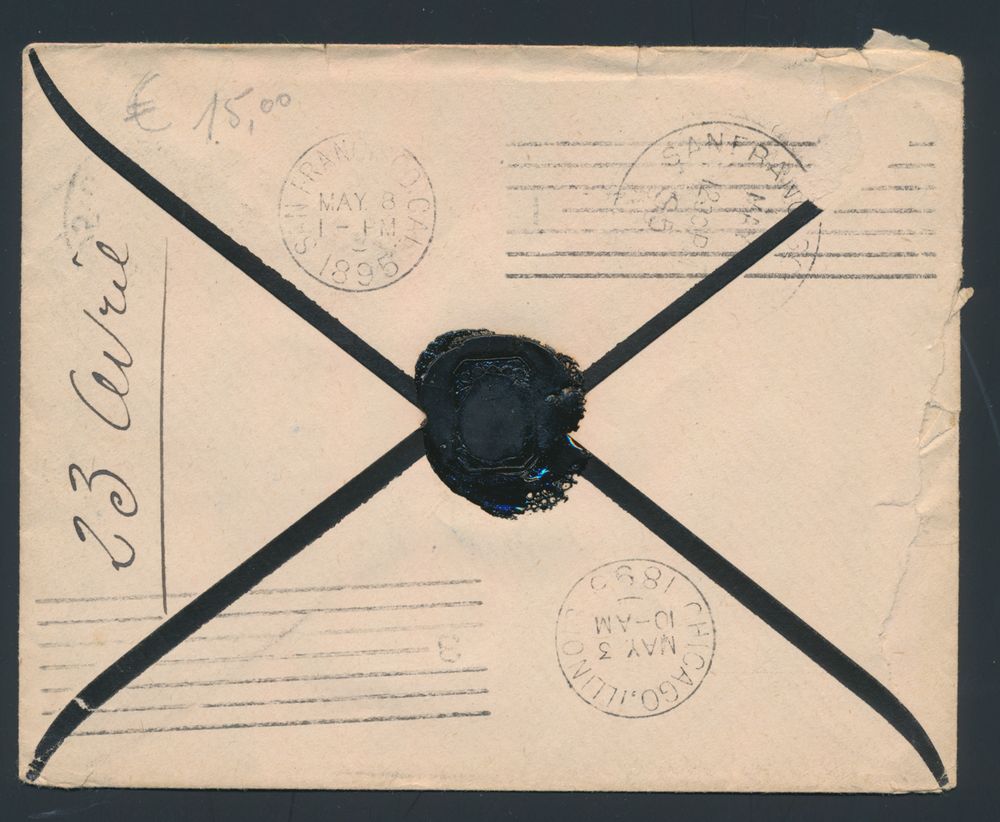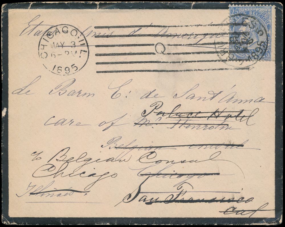 1783 image1895 N° 60 "25c. blue" on letter without content, from Bruxelles, dated May 1895, to San Francisco (America), letter could not be delivered and is forwarded to "Belgian Consul" in Chicago, vf(Image 1) (Image 2)
