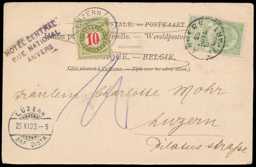 1798 ZK image1903 N° 56 "5c. green", on picture postcard, from Antwerp "Anvers Départ", dated 28 November 03, to Lucerne (Switzerland), with additional penalty postage of "10 decimes", vf(Image 1) (Image 2)