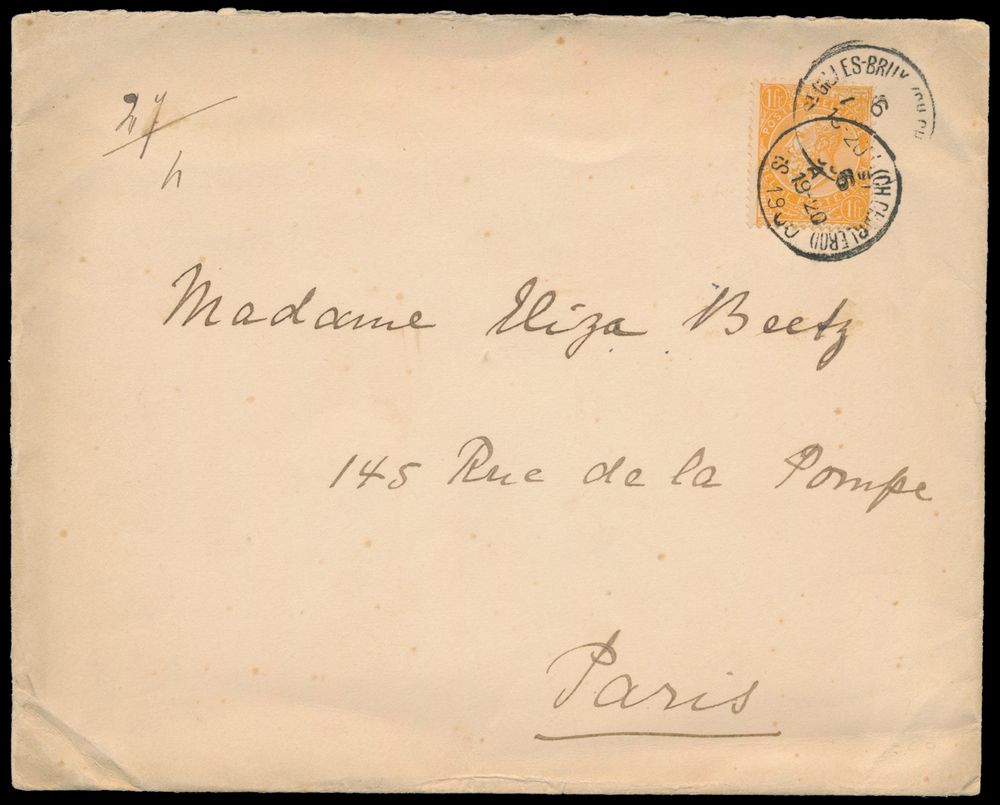 1791 image1900 N° 65 "1fr. orange", with central cancel T1L, "St.Gilles-Brux." (CH Charleroi) EC. Houdeng, dd. 1900, to Paris (France), nice manuscript "47/4", weight 47gr., quadruple postage abroad (4x 15gr. - from 46 to 60gr. - charge of 0.25 per 15gr. 4x is "1fr."), vf (OBP €260).(Image 1) (Image 2)