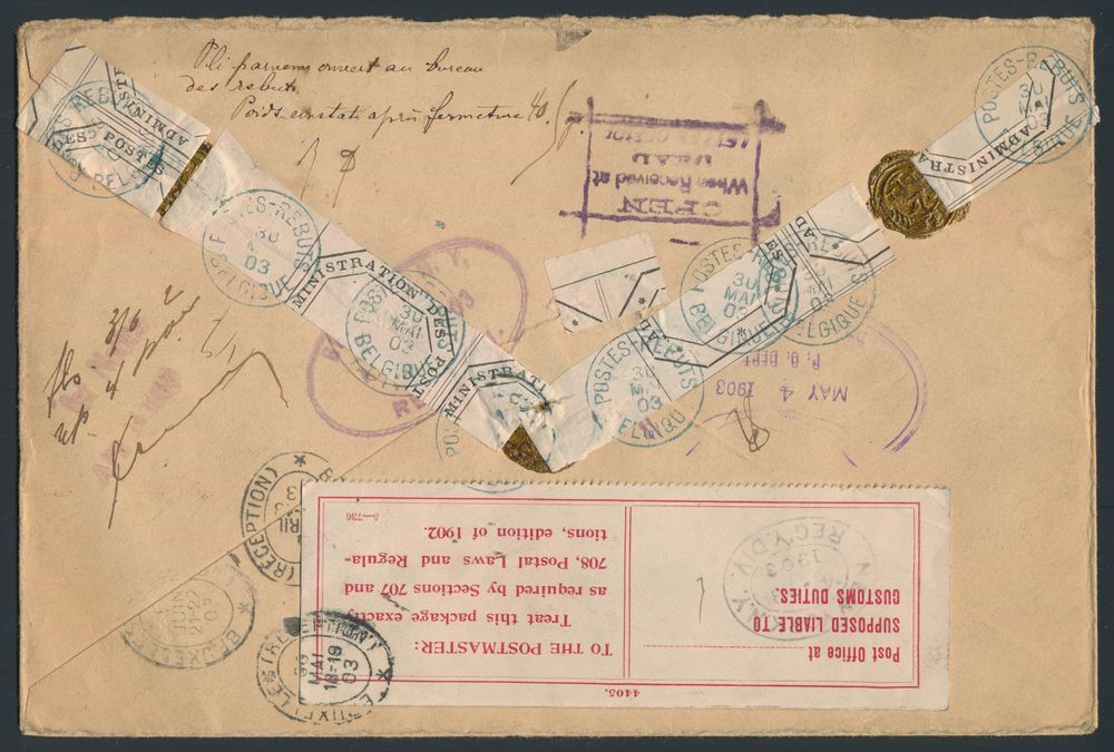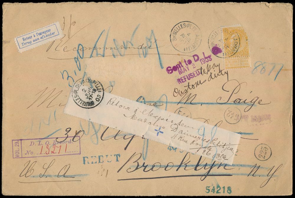 1800 image1903 N° 65 "1fr. orange", from Bruxelles (Bruxelles PL. De La Chapelle), dd. 4 April 1903, to Brooklyn (U.S.A.), nice purple cancellation "Send to D.L.O. may 2 1903 Refused" and manual added "To pay custom Duty" (with D.L.O. record number 13271) letter was refused by addressee, sticker two lines "Retour à l'envoyeur - Return to sender", "REBUT" stamp in blue and several cancelled on reverse, arrival in Brussels on 2 June 1903, with label added from sender, very nice letter, vf/f(Image 1) (Image 2)