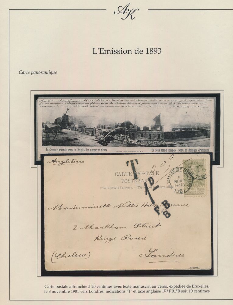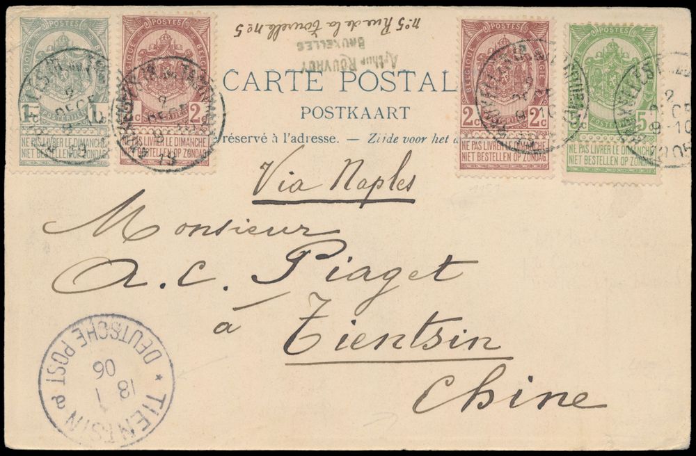 1804 ZK image1905 N° 53, 55 (2x) and 56 on picture postcard, from Bruxelles (Rue du Taciturne), dated 2 December 1905, to Tientsin (China), with arrival date of 18 January 1906, route is via Naples (manuscript), vf(Image 1) (Image 2)