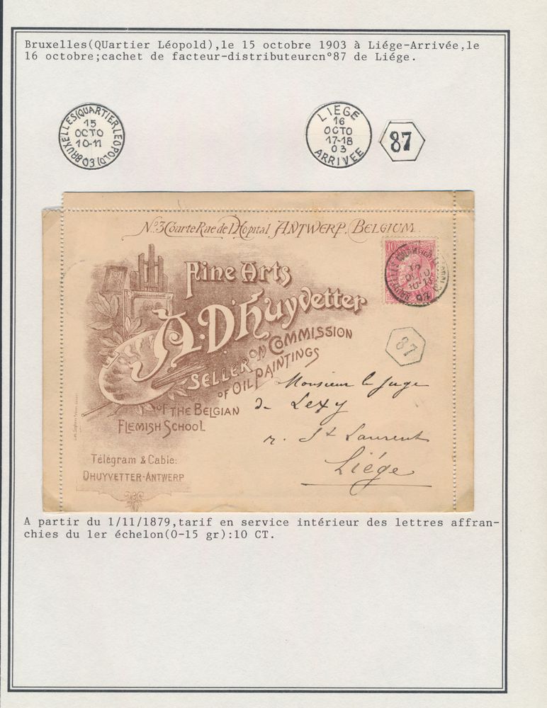 1815 PWST image1910 Hungary, postal stationery from Miskoloz, dated 7 November 1910, with additional franking of Yv. n° 41, "5c. green", on arrival, the PWST is delivered but not at the original address, charge of N° 83 with cancel "Anvers Départ", dated 9 November 1910, vf(Image 1) (Image 2)