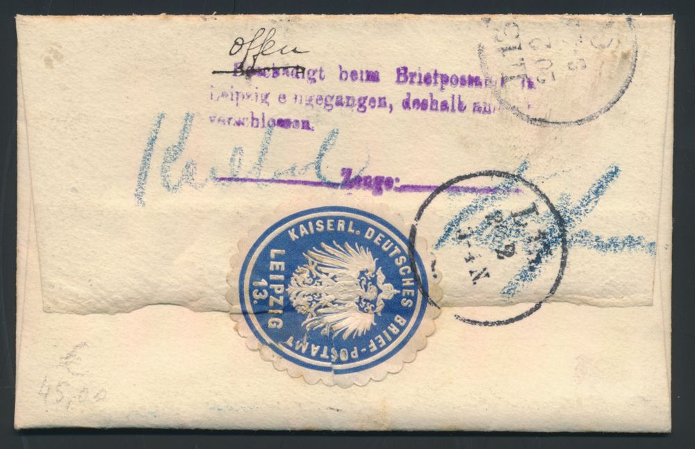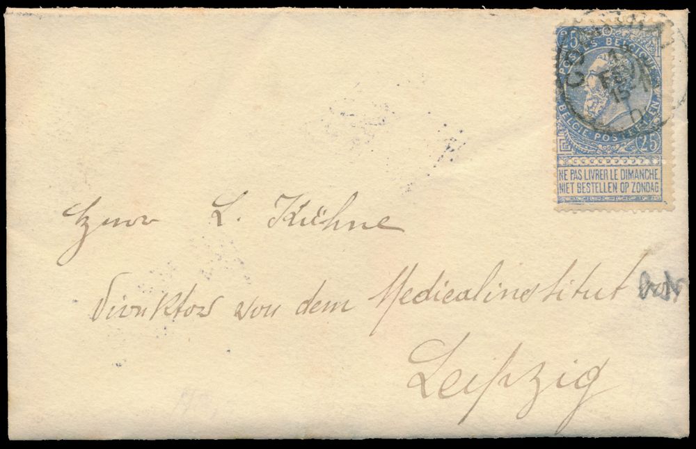 1811 image1906 N° 60 "25c. blue", on letter with contents, from Courtrai, dated 18 November 1906, to Leipzig (Germany), on reverse an indication of the opening of the letter and with intact closing vignette "Kaiserl. Deutsches brief-postambt Leipzig 13", vf.(Image 1) (Image 2)
