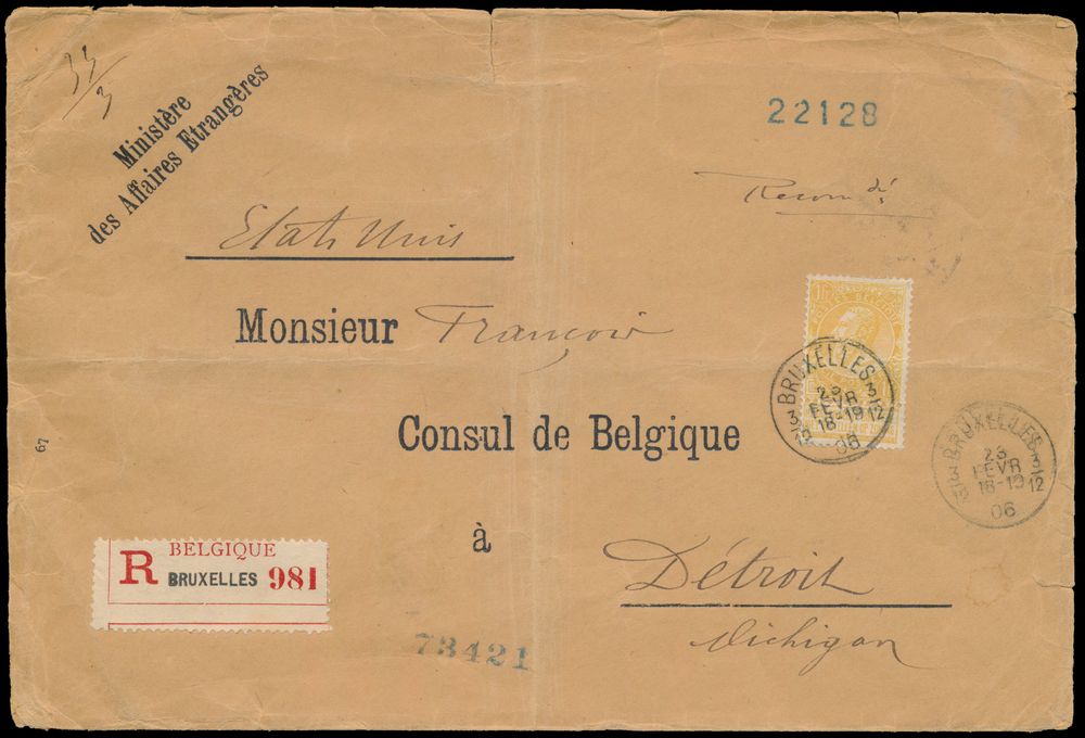 1812 image1906 N° 65 "1fr. orange", on registered envelope from "Ministère des Affaires Etrangères" to the Belgian Consul in Detroit (Michigan - America), dated 23 February 1906, with vignette of "customs duties" (customs) on reverse, vf/f(Image 1) (Image 2)