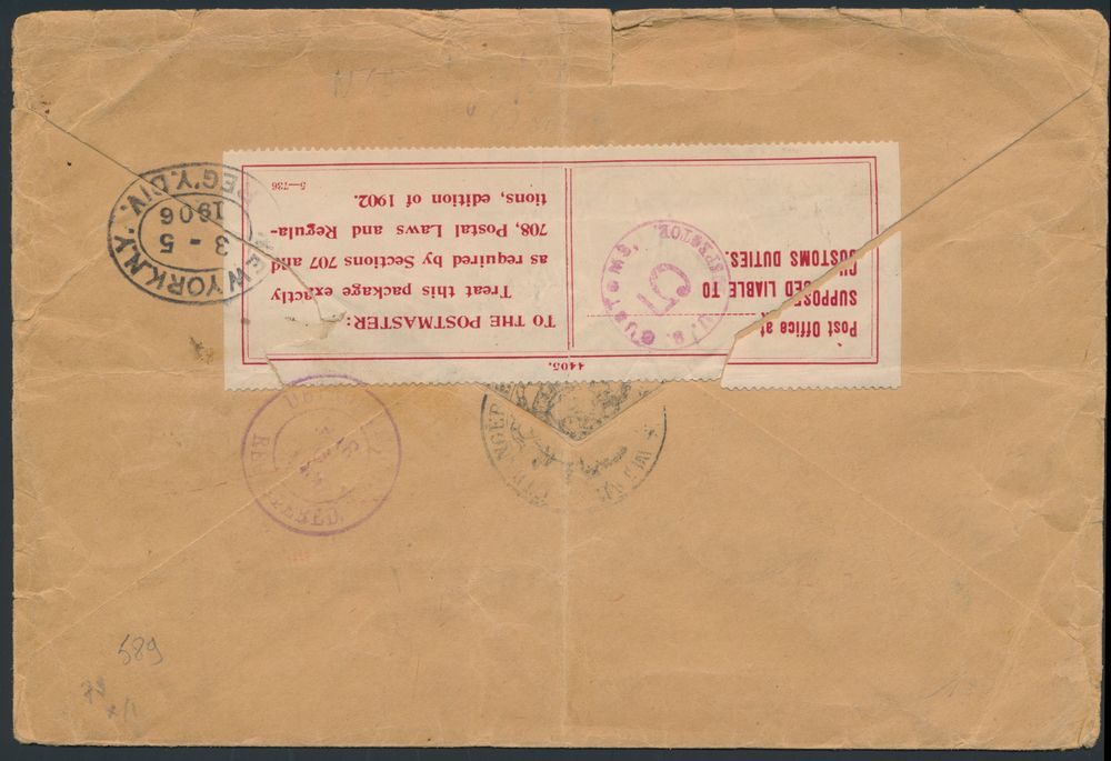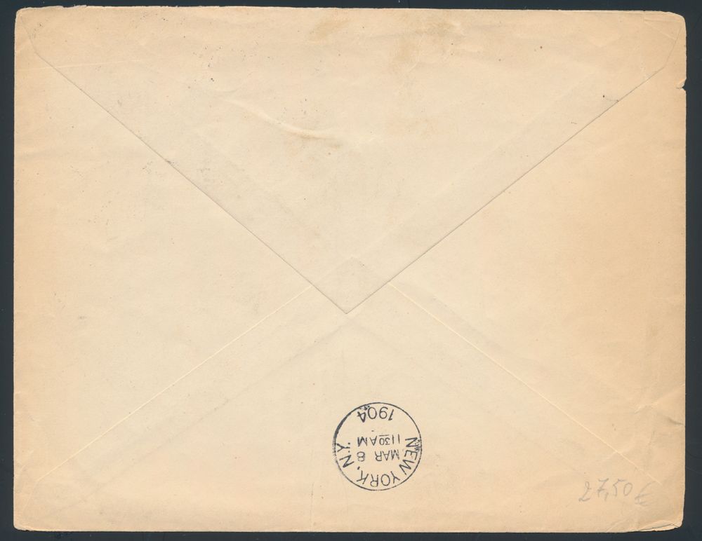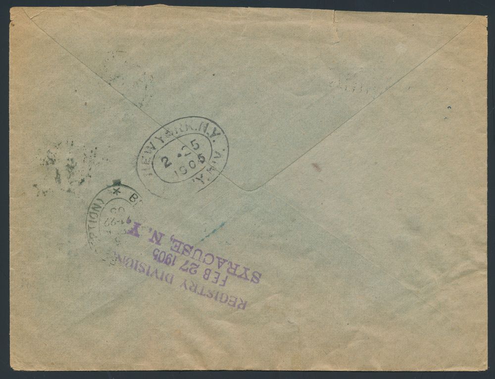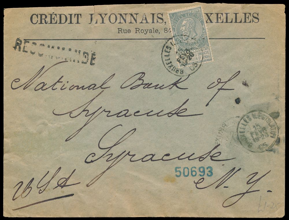 1807 image1905 N° 63 "50c. grey", on registered envelope, from Bruxelles (Législatif), dated 15 February 1905, to Syracuse (N.Y. - USA), black stamp "Recommande" and blue stamp "50693" on front, back contains "arrival postmark New York 25 February 1905" and purple stamp in 3 lines "Registry Division / Feb 27 1905 / Syracuse, N.Y.", vf/f(Image 1) (Image 2)