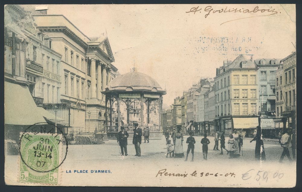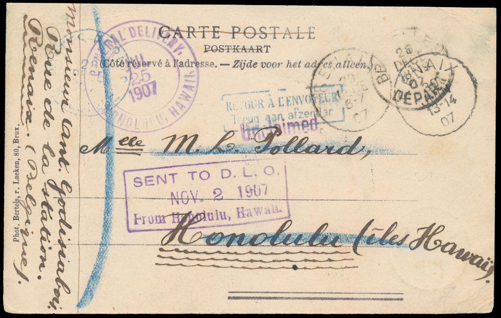1814 ZK image1907 N° 56 "5c. green", on front of a picture postcard, sent from Renaix, dated 30 June 07, to Honolulu (Hawaii). Nice postmarks on reverse, as in purple 3 lines "Sent to D.L.O. / Nov. 2 1907 / from Honolulu, Hawaii", vf.(Image 1) (Image 2)