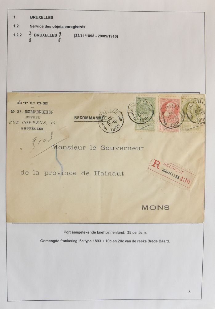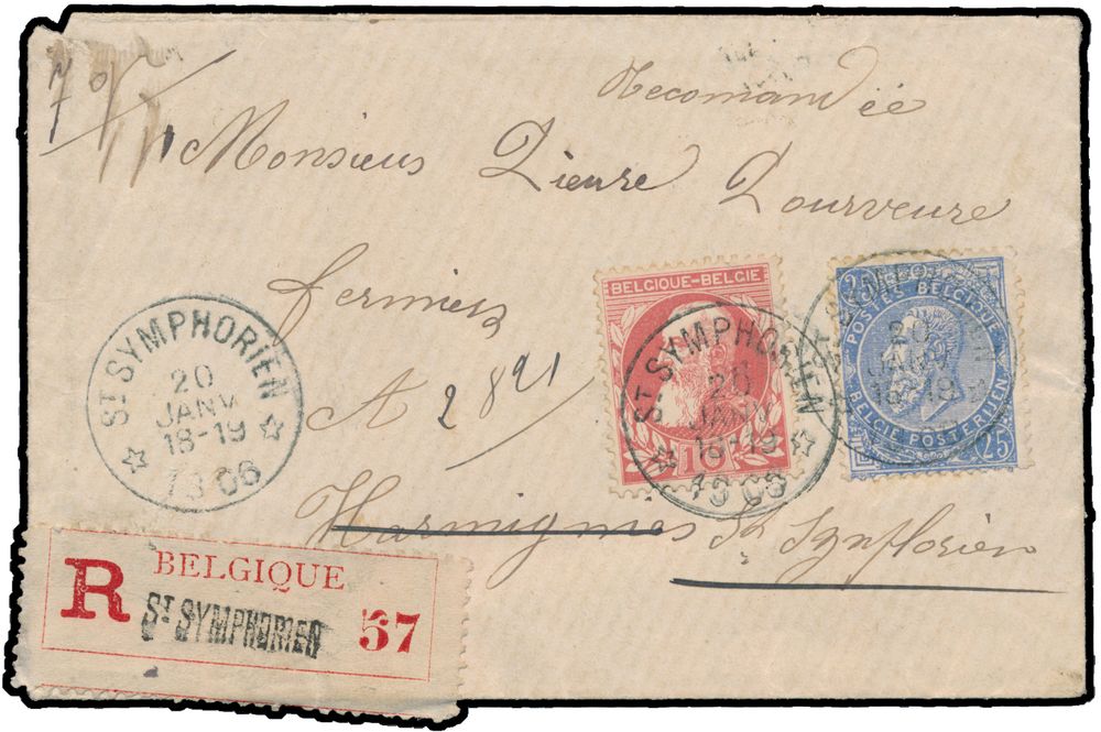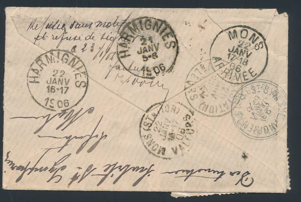 1809 image1906 Mixed franking Fine and Coarse beard. N° 60 and 74 on registered letter, from St Symphorien, dated 20 January 1906, to Harmignies, multiple postmarks on reverse of Harmignies (21 and 22 January), Mons arrivee (22 January) and Mons (Station) valeurs (20 and 22 January), manuscript "Refuser sans Motif...", vf(Image 1) (Image 2)