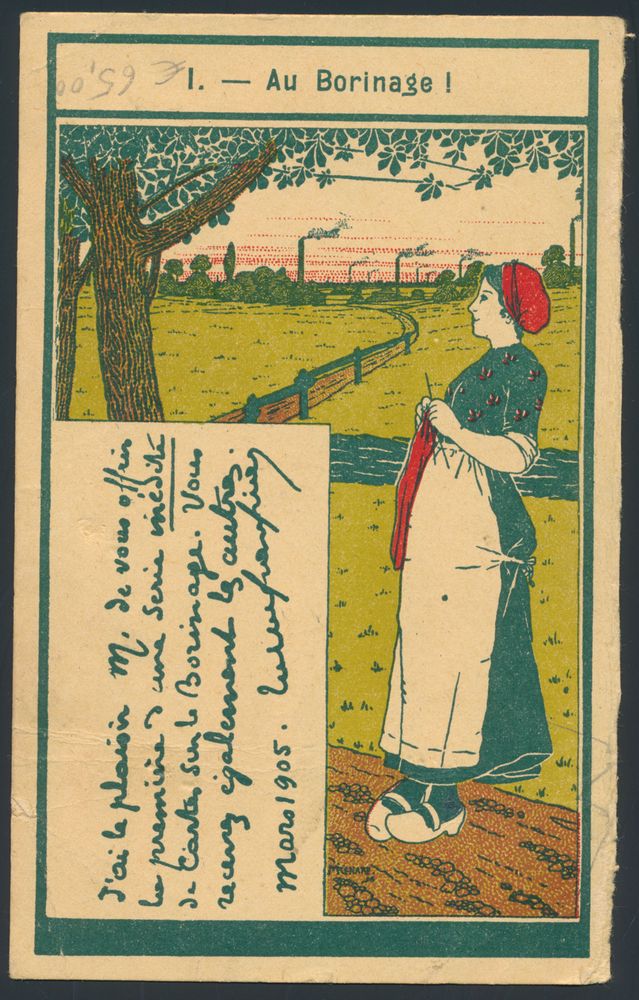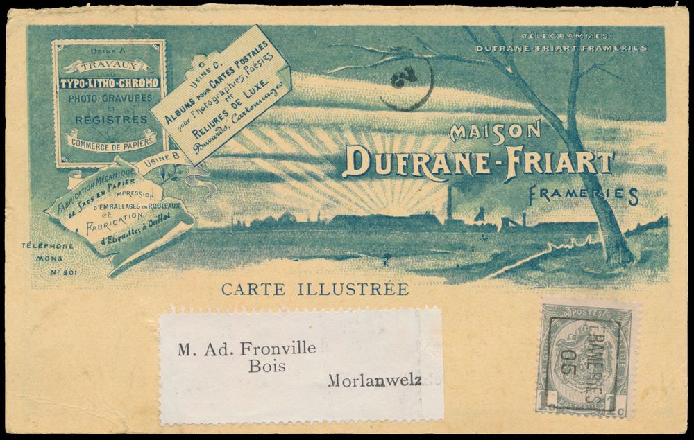 1808 image1905 "1c." preo "Frameries 05", on illustrated picture postcard from the firm "Maison Dufarne-Friart", to Morlanwelz (firm of postcard albums), vf/f(Image 1) (Image 2)