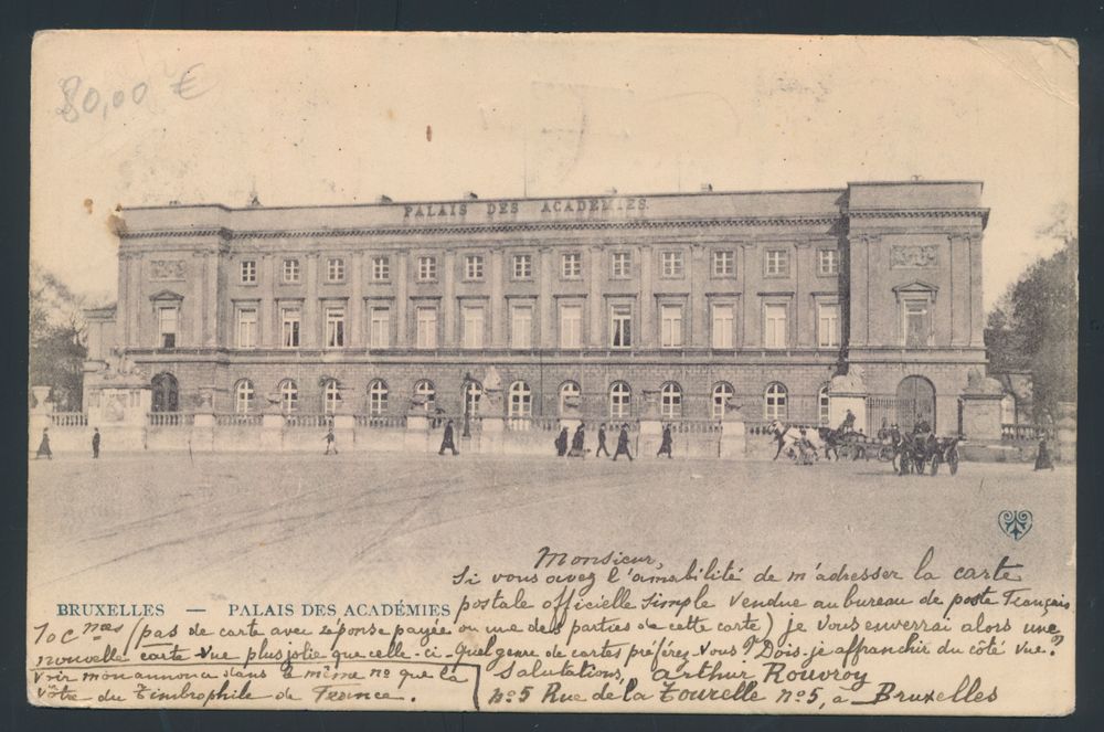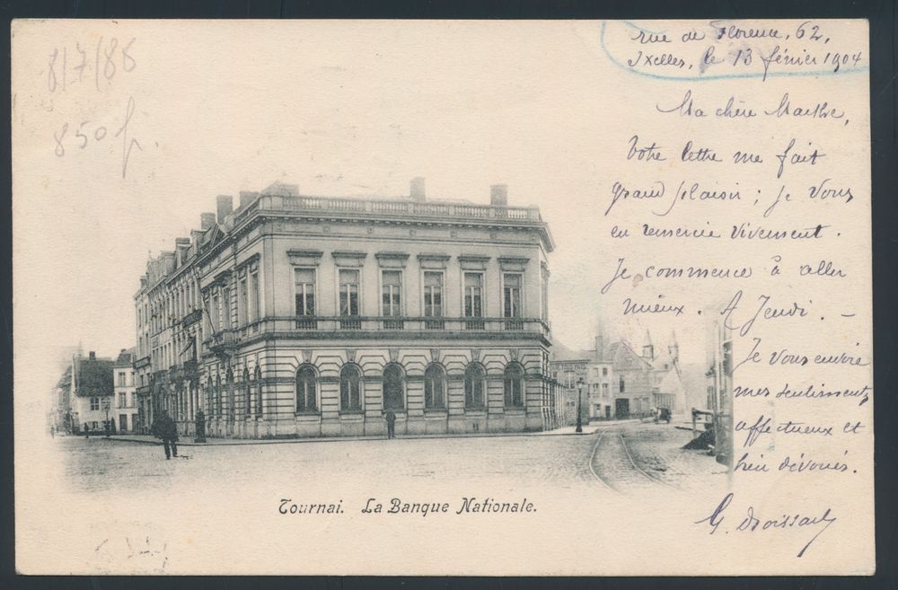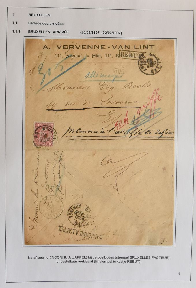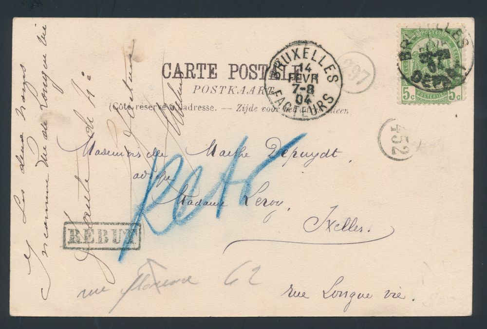1801 ZK image1904 N° 56 "5c. green", on picture postcard from Tournay, cancelled Bruxelles Depart, dated 13 February 1904 to Ixelles, with arrival postmark "Bruxelles Facteurs", dated 14 February 1904, postman's stamp 297 and 452, "rebut" stamp in frame black, nice manuscript of the postman "Inconnue rue Longue Vie", with his signature, vf(Image 1) (Image 2)