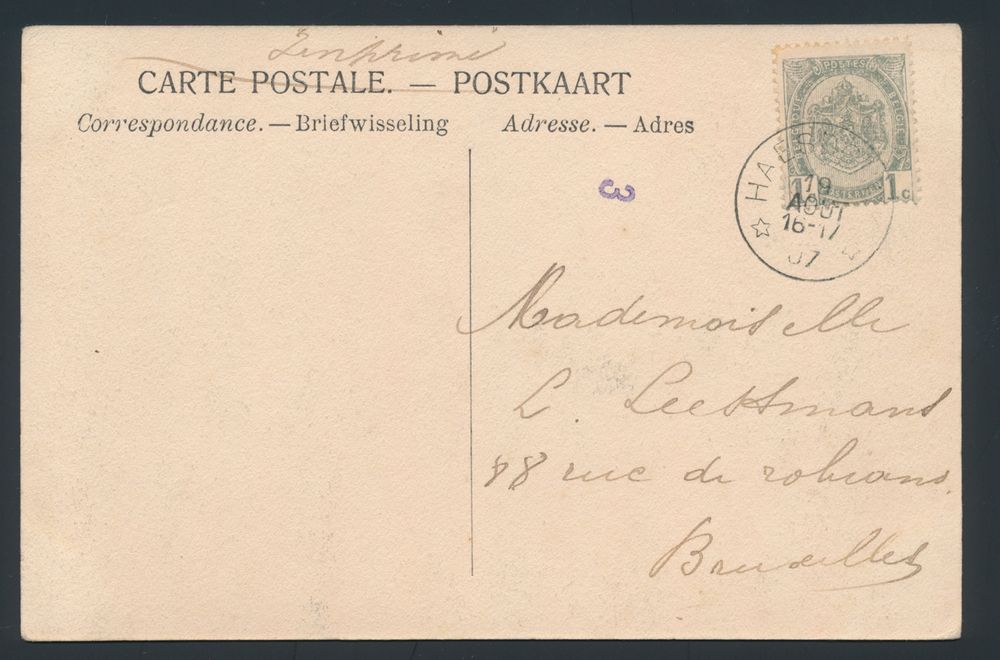 1813 image1907 N° 53 "1c. grey", on postcard, cancelled relay Haasdonck, T1L, dated 19 August 07, vf(Image 1) (Image 2)