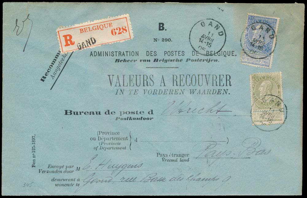 1806 image1905 N° 59 and 60, on letter from "Administration des postes de Belgique - Valeurs a Recouvrer" (values to be recovered), from Gand, dated 11 April 1905, to Utrecht, not common document, vf(Image 1) (Image 2)