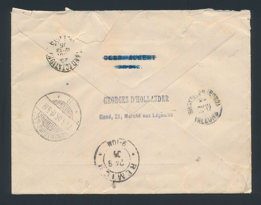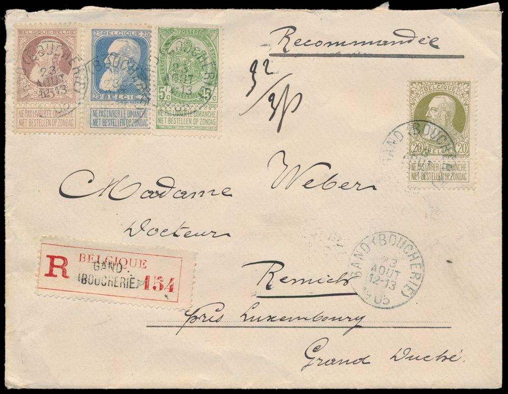 1805 image1905 N° 56, 75, 76 and 77 on registered envelope, with manuscript "RECOMMANDÉ", from Gand (Boucherie), dated 23 August 1905, to Remich (G.H. Luxembourg), weight indication 32/3p - Triple charge abroad, vf(Image 1) (Image 2)