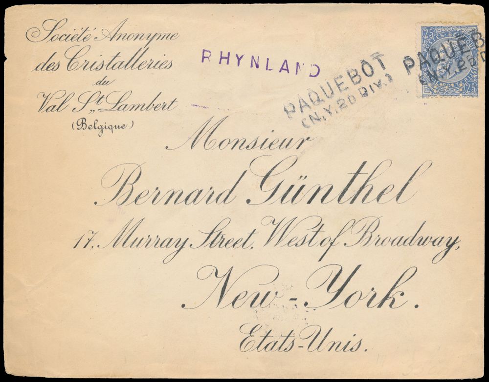 1802 image1904 N° 60 "25c. blue", on letter without content, with letter head "Sociéte Anonyme des Cristalleries du Val St. Lambert", no round departure cancelled, but a devaluation with "Paquetbot (N.Y. 20 Div.)", to New-York (America), purple stamp "Rhynland" on front, arrival postmark New York, dated 8 March 1904, vf(Image 1) (Image 2)
