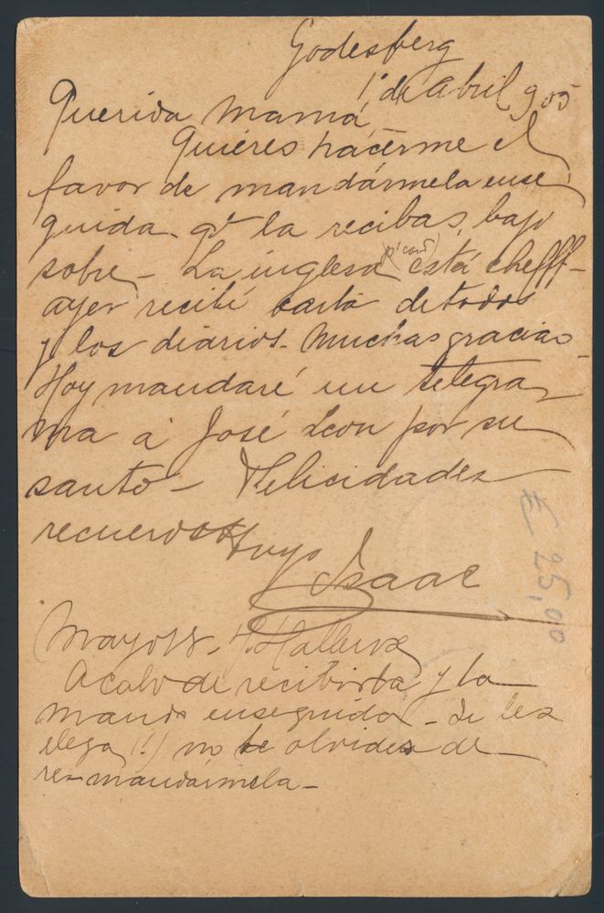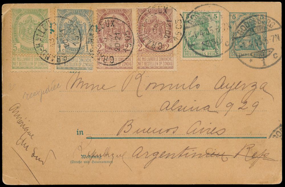 1803 PWST image1905 N° 53, 55 (2x) and 56 on German postcard, first sent "5 + 5pf." from Godesberg, dated 14 May 1905, to Grand-Halleux, thence sent further on 18 May to Buenos Aires, rare, vf.(Image 1) (Image 2)