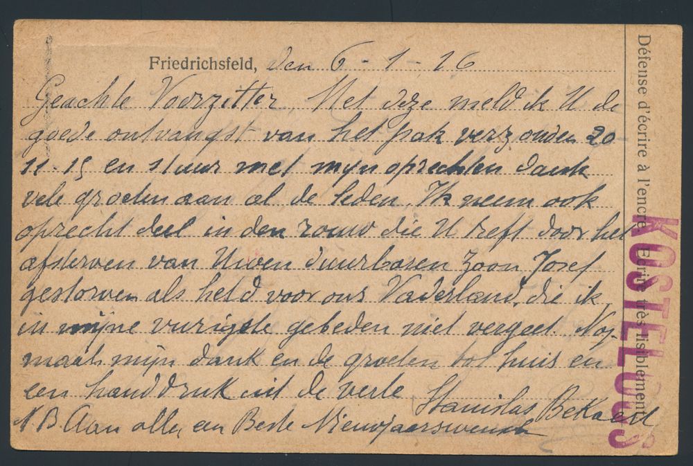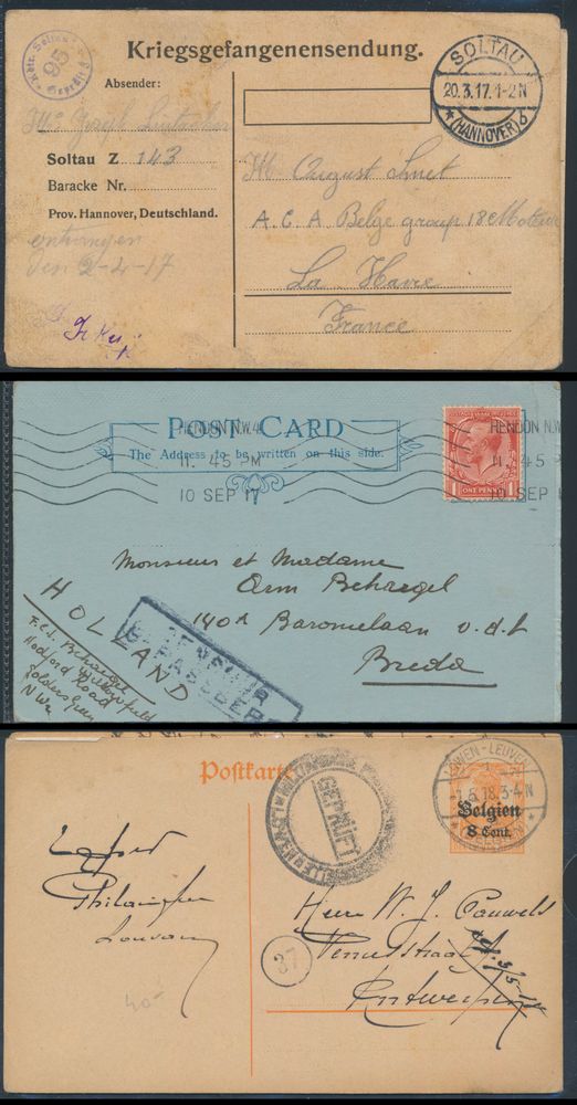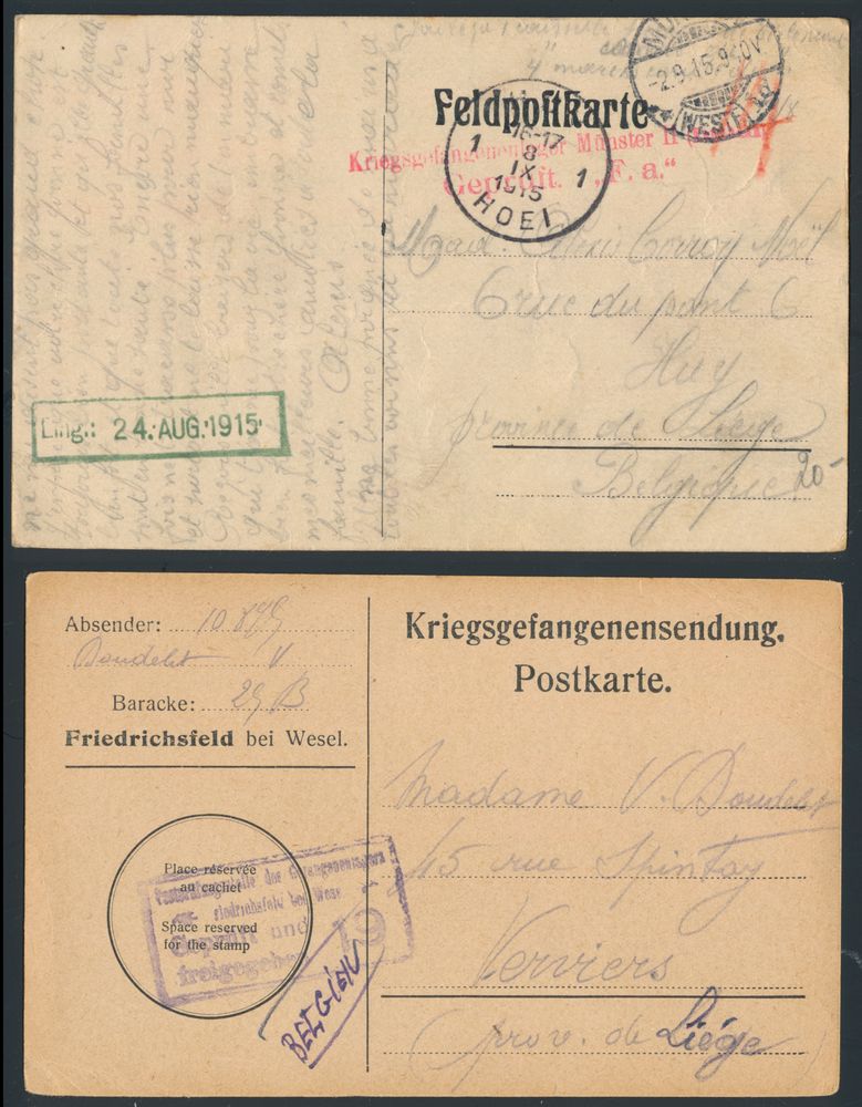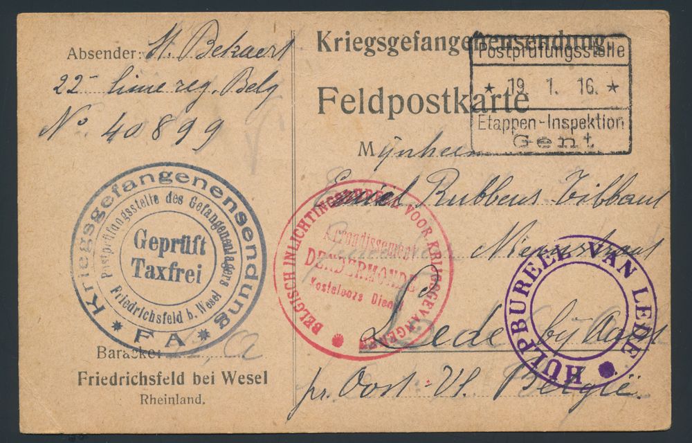 1947 PWST image1916 Kriegsgefangensendung - Feldpostkarte, from Friedrichsfeld b. Wesel, dated 19.1.16, nice cancellations of "Belgian intelligence bureau for prisoners of war" and "Hulpbureel van Lede", sender is Stanislas Bekaert, vf(Image 1) (Image 2)