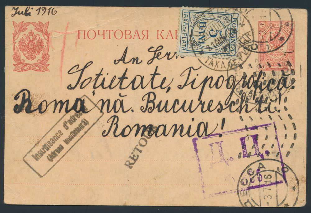 1946 image1916 July, EP 3/2 sent from "d'Odessa" to Romania, with censorship, rate valued with "5c." in Bucharest, with griffe "Insuffisance d'adresse" and return, vf(Image 1) (Image 2)