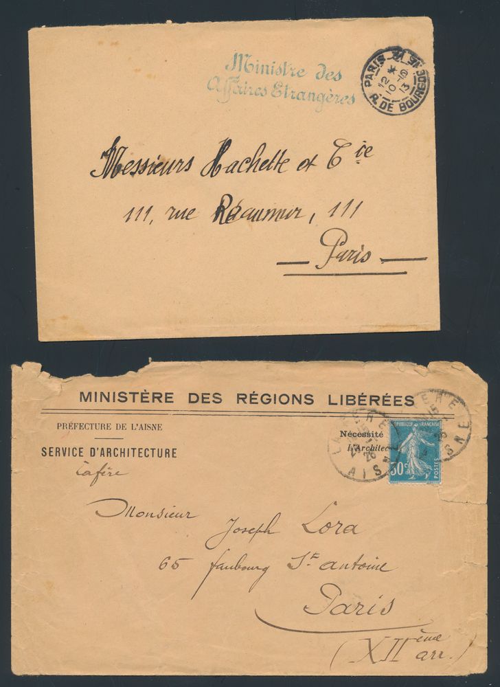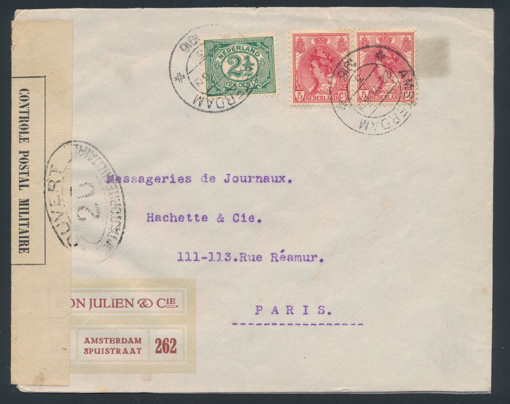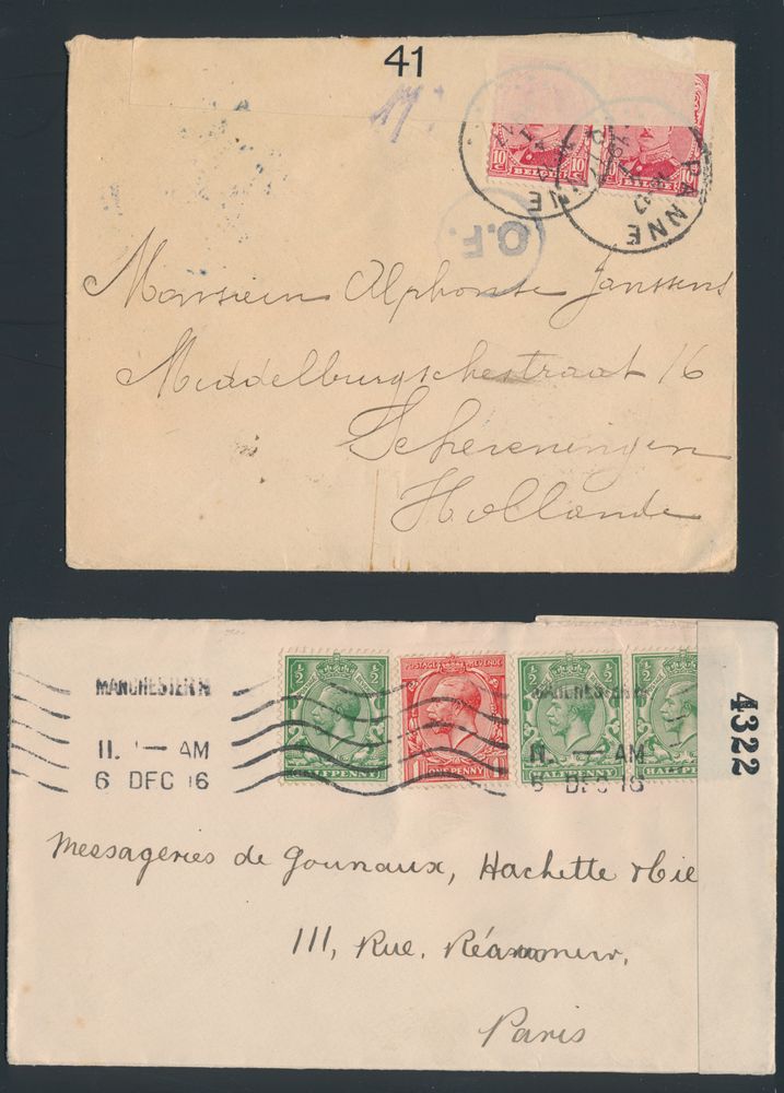 1955 imagePostes et Telegraphes sticker, together with oval cancellation "Ouvert par l'autorite Militaire", two letters, one from Amsterdam to Paris, one from Dunkerque to La Haye, vf(Image 1) (Image 2)