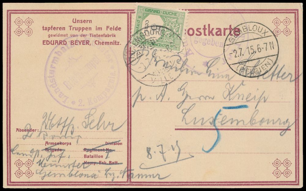1944 ZK image1915 Postcard sent from Gembloux, dated 2 June 1915, censored, rate valued by Luxembourg army, vf(Image 1) (Image 2)