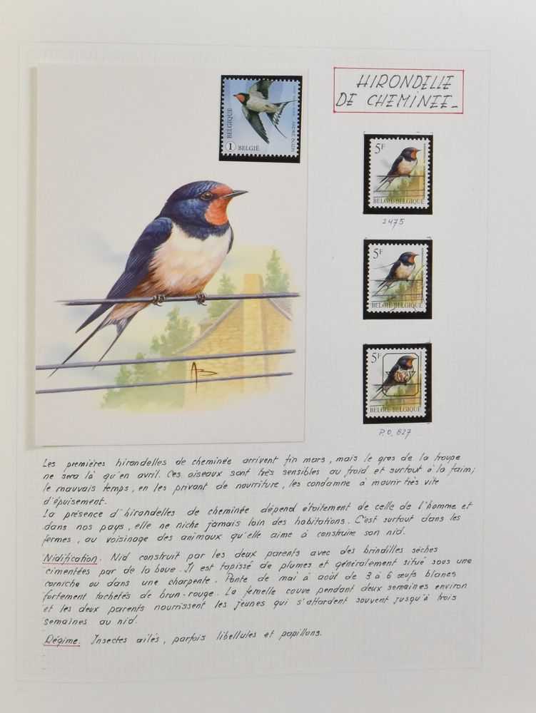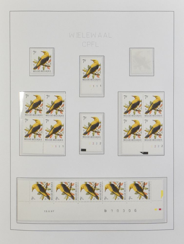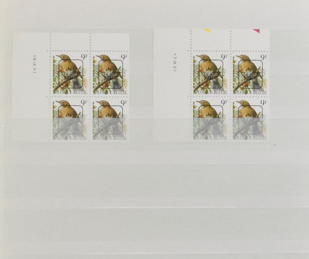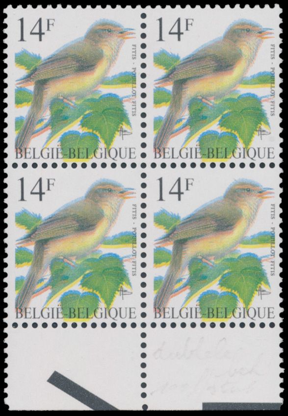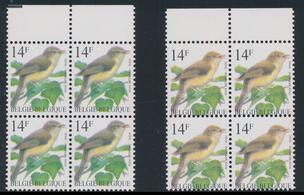 2032 nh imageN° 2623-Cu "14fr. Fitis", in block of four, three times with different curiosity "double printing", the different printing is clearly noticeable on the beak, there are also colour differences, vf(Image 1) (Image 2)