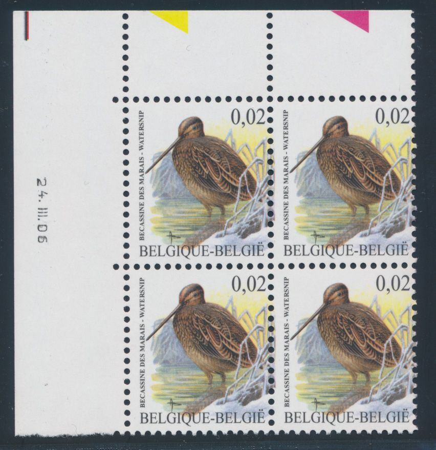 2040 nh imageN° 3199-Cu "0.02€ snipe", in block of four, with curiosity "shifted printing", vf(Image 1)