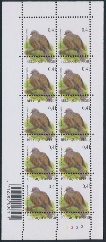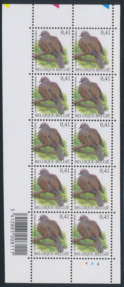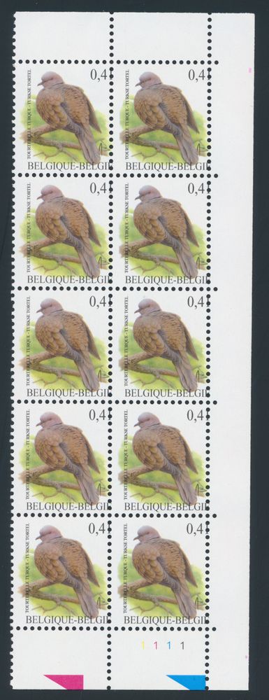 2039 nh imageN° 3135-Cu "€0.41 Eurasian collared dove", in souvenir sheet of 10, plate 1, with curiosity "vertical misalignment", vf(Image 1)