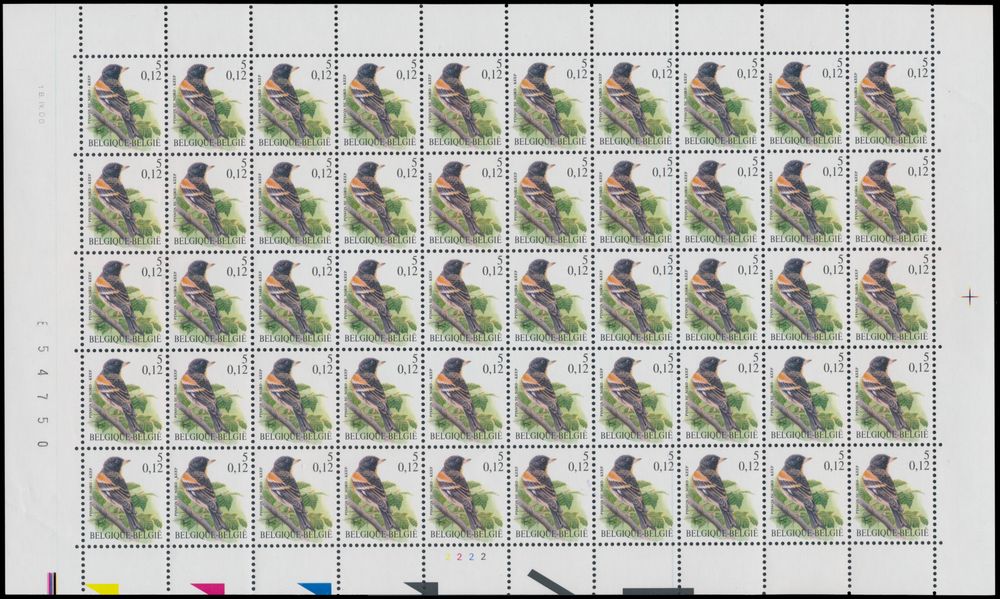 2035 nh imageN° 2921-Cu "5fr./0.12 Keep", in full sheet, plate 2 - printing date 18.IV.00, with curiosity "blue squeegee mark" in the seventh vertical row across the entire sheet, at the level of the value number, exceptional in full sheet, vf(Image 1)