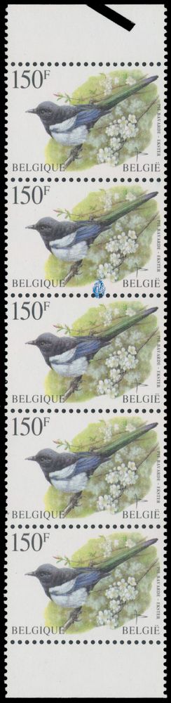 2033 nh imageN° 2697-Cu "150fr. magpie", in upright strip of 5 stamps, with curiosity "beautiful stain under the blossom up to the perf" on second stamp, spectacular, vf(Image 1)