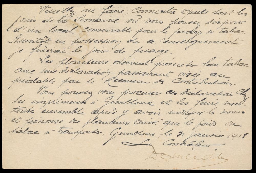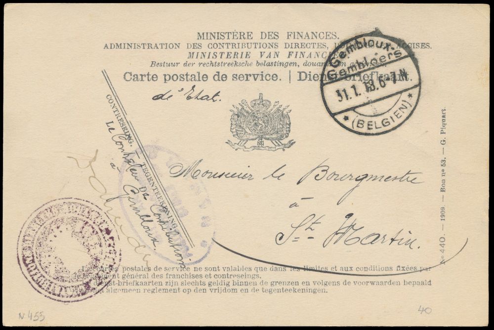 2236 image1918 Carte correspondance de service (Ministère des finances), cancelled Gembloux (Gembloers), dated 31 January 1918, to Saint-Martin (addressee of the mayor), vf(Image 1) (Image 2)
