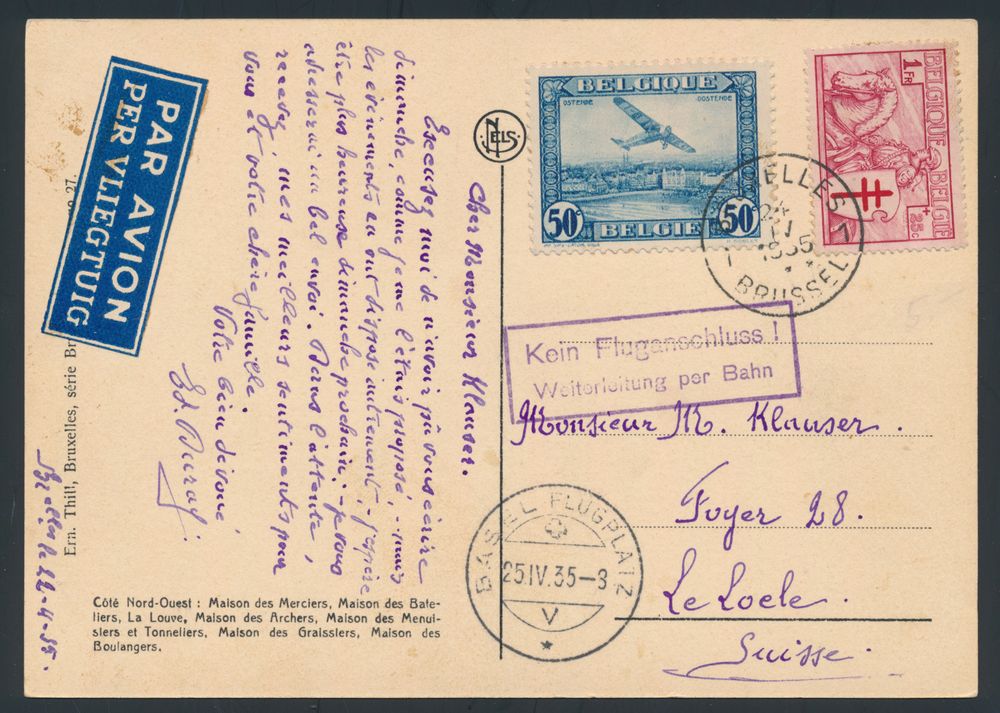 2230 image1935 PA 1 and n° 398 "Ridder 1fr." on letter from Brussels 24.IV.1935 to Le Locle (Switzerland), with "Kein Fluganschluss! Weiterleitung per Bahn", vf(Image 1) (Image 2)