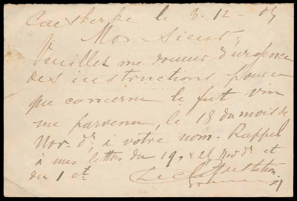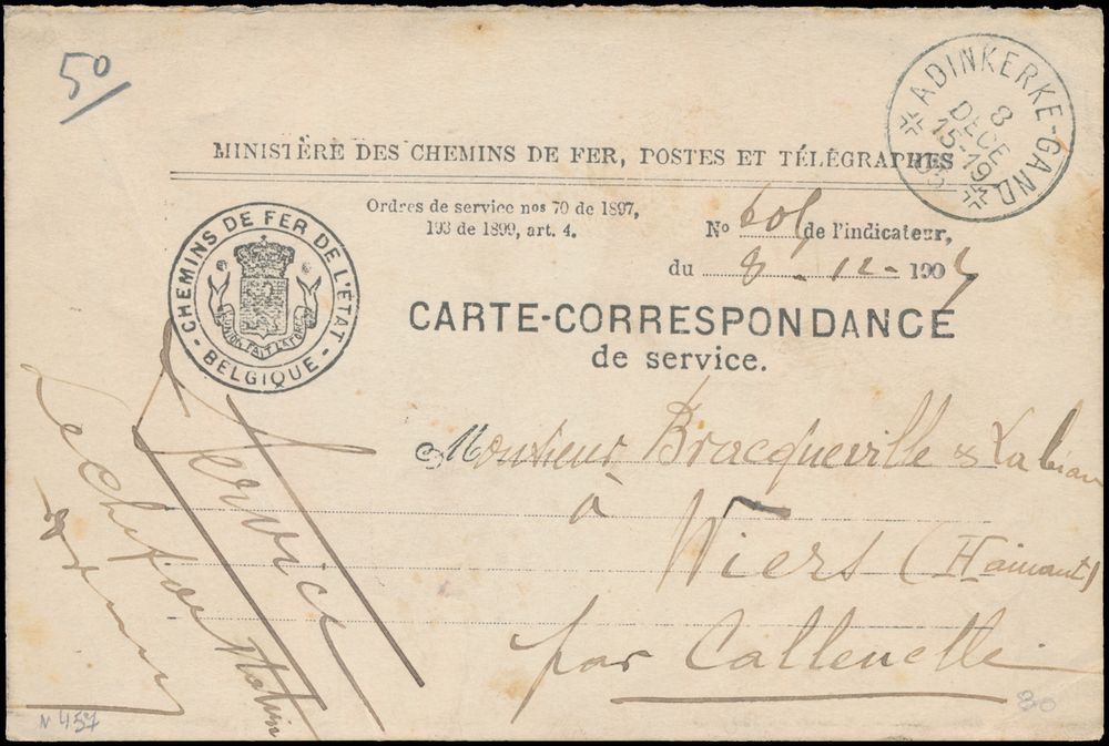 2235 image1905 Carte correspondance de service (Ministère des chemin de fer, postes et telegraphes), cancel Adinkerke-Gand, dated 8 December 1905, to Wiers, card has a salutation from Caeskerke, vf(Image 1) (Image 2)
