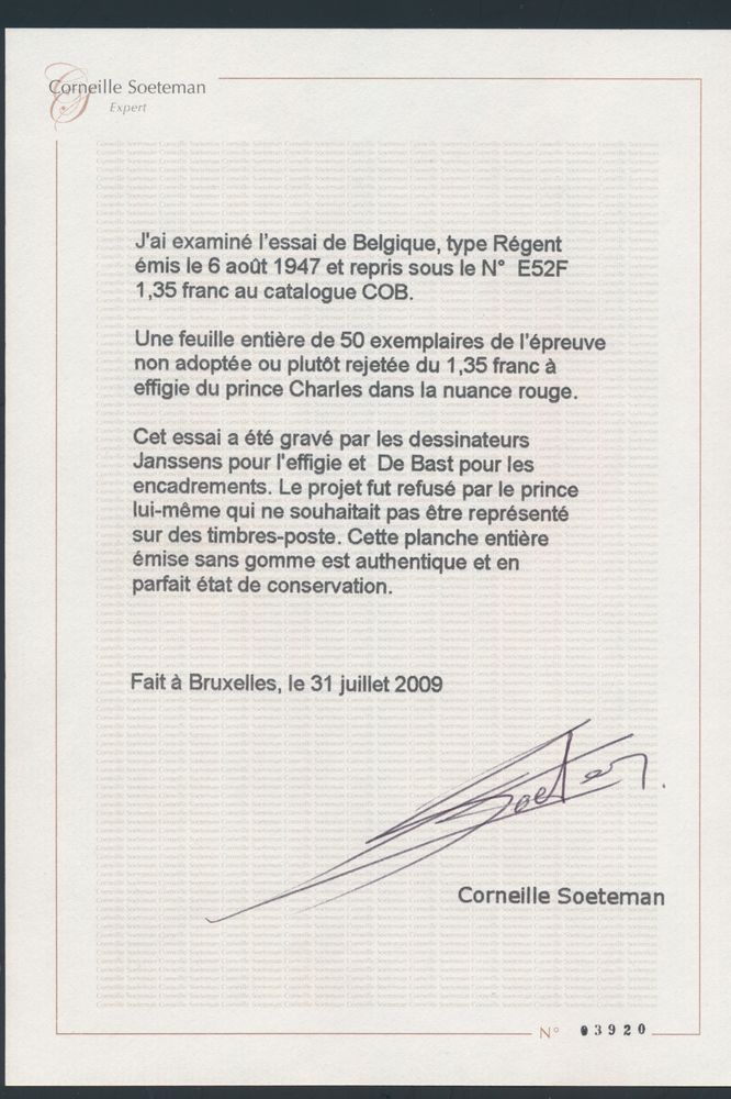 2473 imageE52F, Type De Bast, imperforate, '1.35fr.' 3rd trial - Red, with Soeteman certificate, vf (OBP €8,750)(Image 1) (Image 2)
